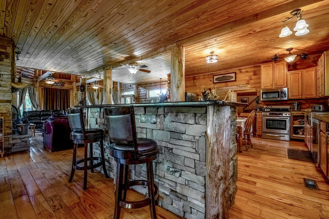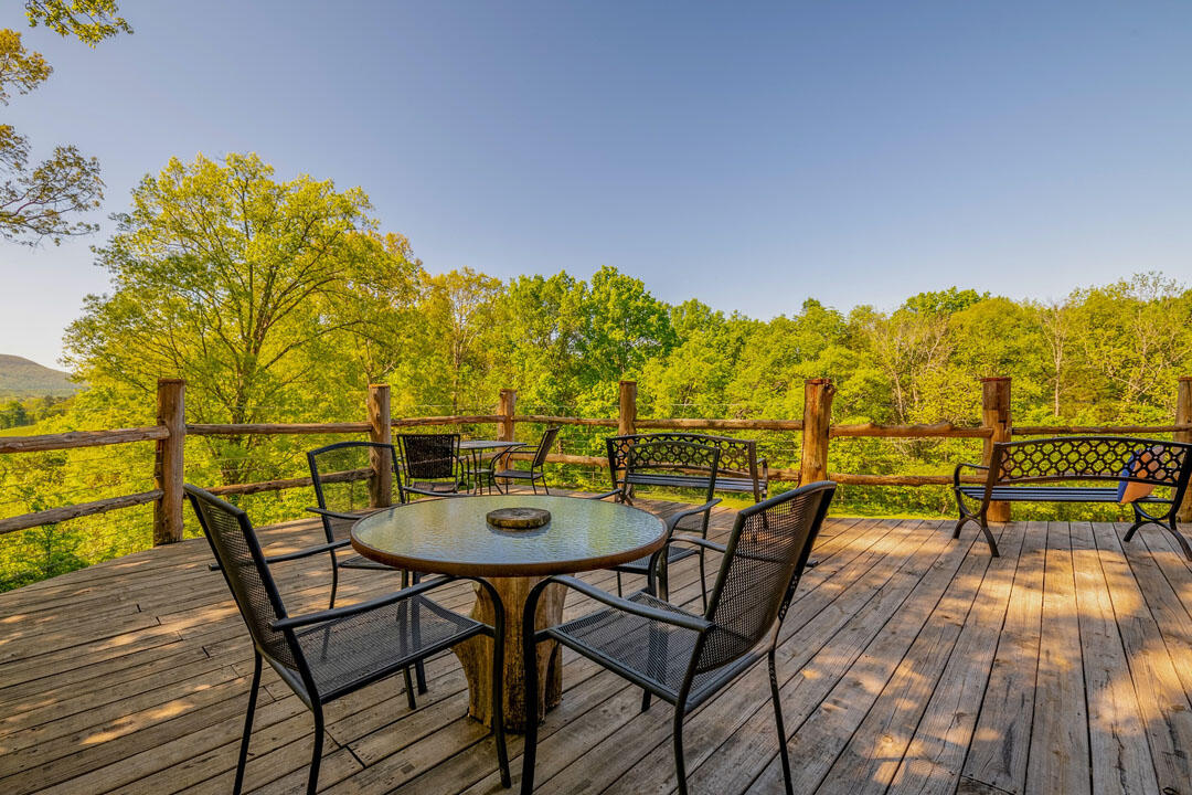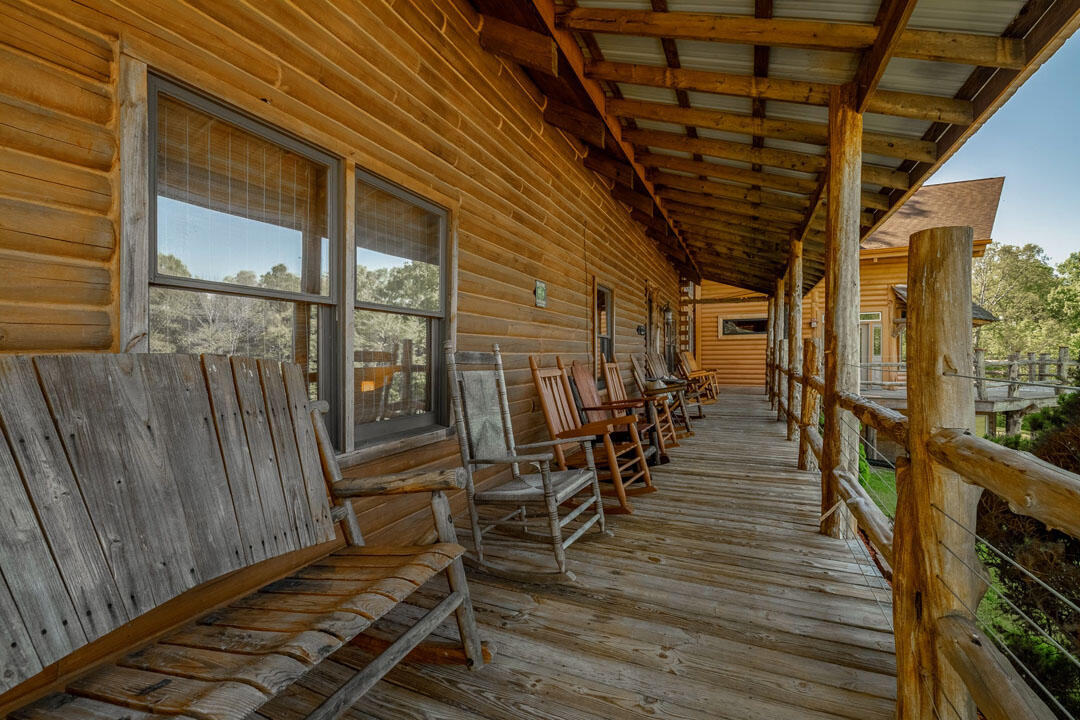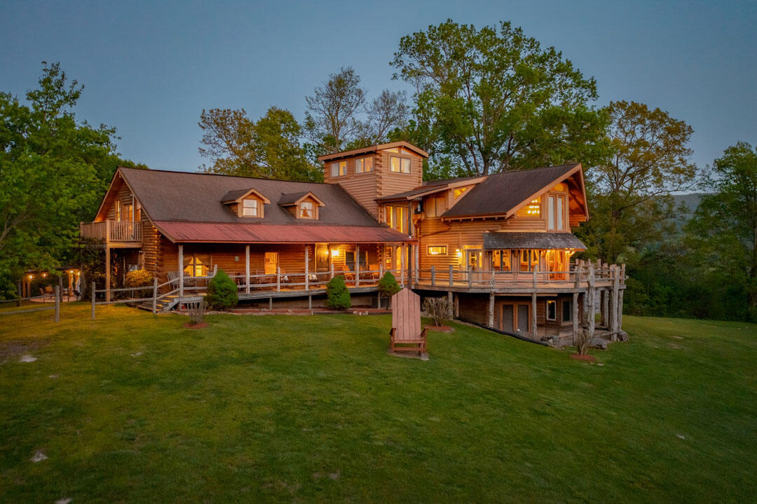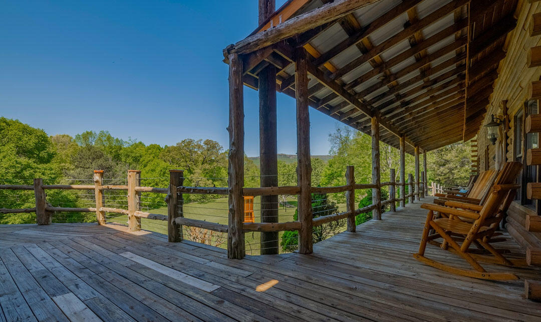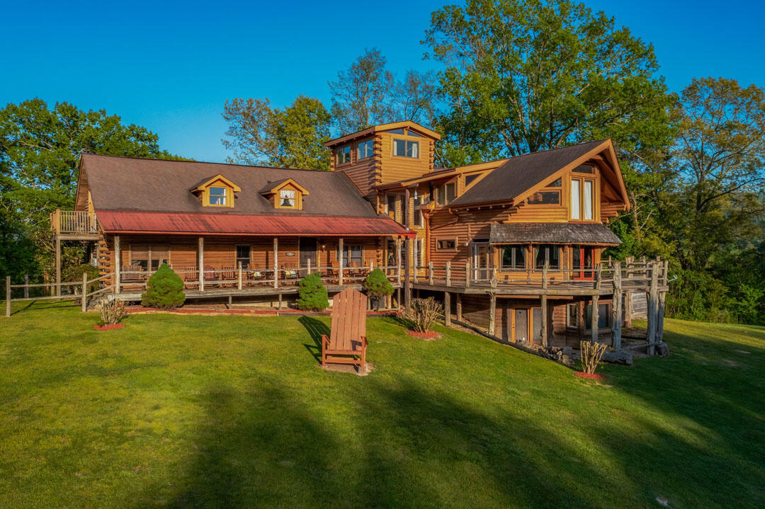 A magnificent 6,000 sq. ft. log cabin nestled in a cove with gorgeous mountain views. Perfect for family reunions and corporate retreats having 2 kitchens and 2 great rooms. Over 2,500 sq. ft. of outdoor living space including a covered front porch with rockers, an enclosed porch with foosball table and sauna, and 3 balcony decks. Enjoy views from the large side deck or visit the hot tub and 36-ft inground pool. Gather around the fire pit and outdoor fireplace in the evenings. The 3-acre front yard has plenty of play space, with a mile-long hiking trail leading through the woods to the 30-foot wide Chickamauga Creek that runs through the property.