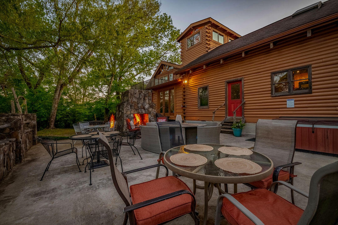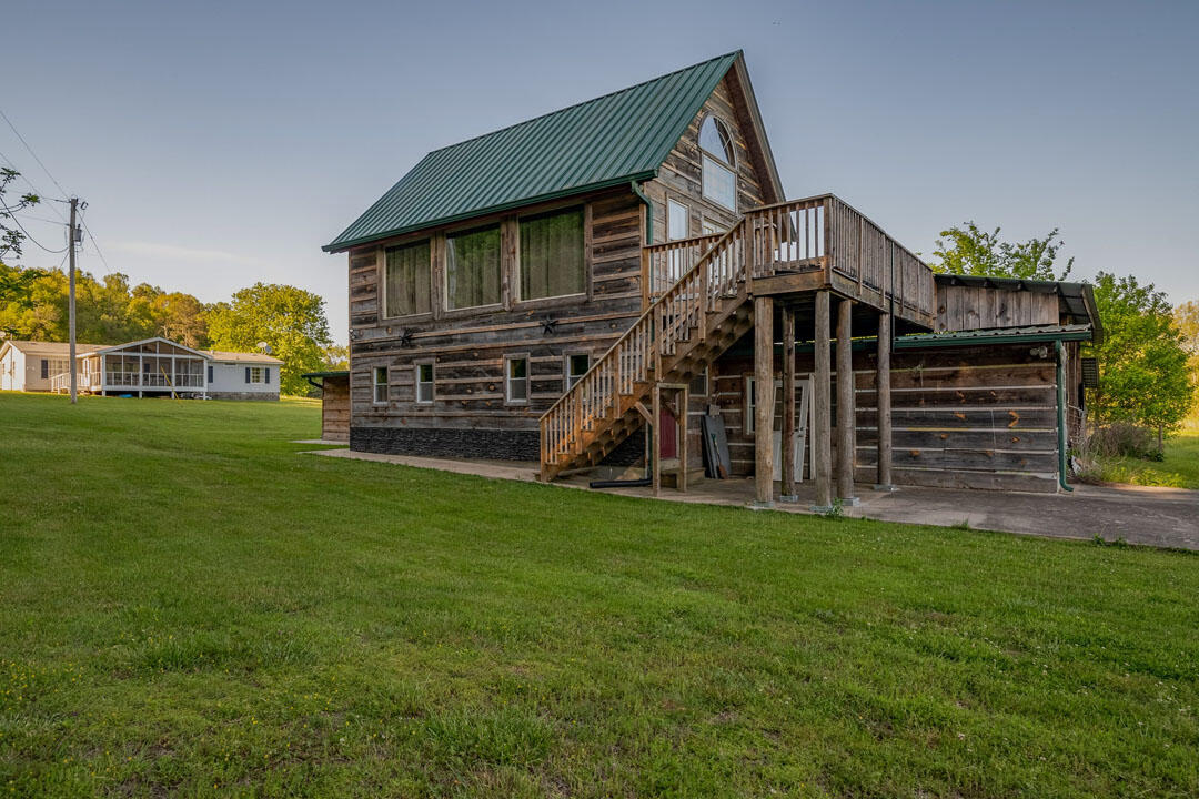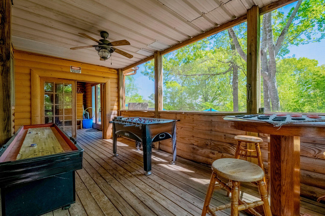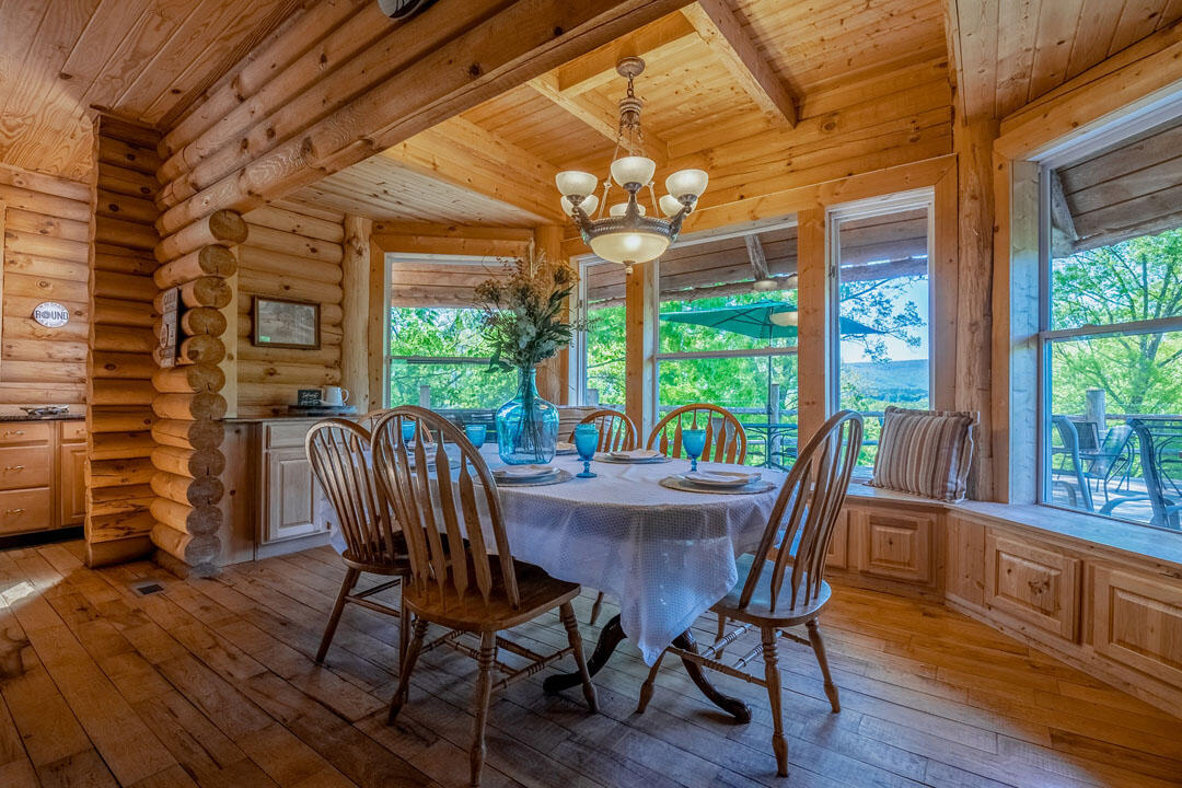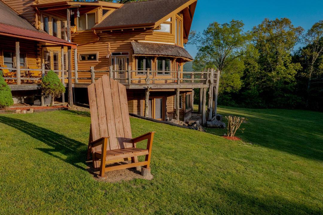 A magnificent 6,000 sq. ft. log cabin nestled in a cove with gorgeous mountain views. Perfect for family reunions and corporate retreats having 2 kitchens and 2 great rooms. Over 2,500 sq. ft. of outdoor living space including a covered front porch with rockers, an enclosed porch with foosball table and sauna, and 3 balcony decks. Enjoy views from the large side deck or visit the hot tub and 36-ft inground pool. Gather around the fire pit and outdoor fireplace in the evenings. The 3-acre front yard has plenty of play space, with a mile-long hiking trail leading through the woods to the 30-foot wide Chickamauga Creek that runs through the property.
