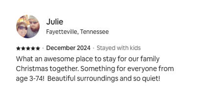 Come see why we have been featured on the Bravo Channel, The Up Network, and Southern Lady Magazine.Connect with nature as you watch a herd of deer, the sunrise or moon rise over Pigeon Mtn, the sunset over Lookout Mtn, the incredible starry night sky, hike to the creek, or visit the nearby 80 foot waterfall. Truly a wonderful place to make precious memories with family or friends.